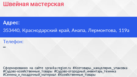 Швейная мастерская по адресу 353440, Краснодарский край, Анапа, Лермонтова, 119а в дальнейшем Организация, размещена в следующих категориях: