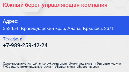 Южный берег, управляющая компания по адресу 353454, Краснодарский край, Анапа, Крылова, 23/1 в дальнейшем Организация, размещена в следующих категориях: