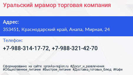 Уральский мрамор, торговая компания по адресу 353451, Краснодарский край, Анапа, Мирная, 24 в дальнейшем Организация, размещена в следующих категориях: