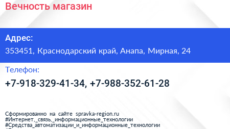 Вечность, магазин по адресу 353451, Краснодарский край, Анапа, Мирная, 24 в дальнейшем Организация, размещена в следующих категориях:
