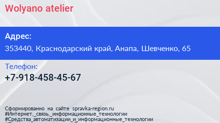 Wolyano atelier по адресу 353440, Краснодарский край, Анапа, Шевченко, 65 в дальнейшем Организация, размещена в следующих категориях: