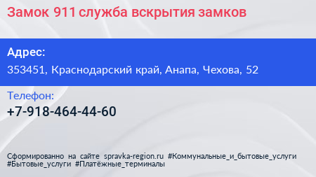 Замок 911, служба вскрытия замков по адресу 353451, Краснодарский край, Анапа, Чехова, 52 в дальнейшем Организация, размещена в следующих категориях: