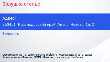 Золушка, ателье по адресу 353451, Краснодарский край, Анапа, Чехова, 16/2 в дальнейшем Организация, размещена в следующих категориях: