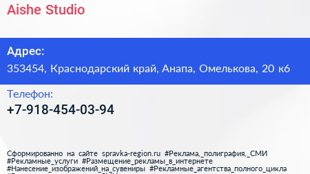Aishe Studio по адресу 353454, Краснодарский край, Анапа, Омелькова, 20 к6 в дальнейшем Организация, размещена в следующих категориях: