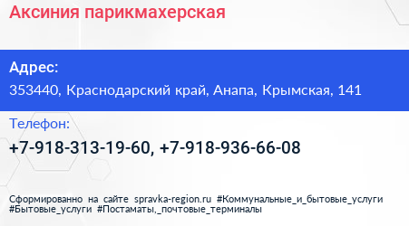 Аксиния, парикмахерская по адресу 353440, Краснодарский край, Анапа, Крымская, 141 в дальнейшем Организация, размещена в следующих категориях: