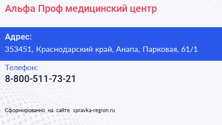 Альфа Проф, медицинский центр по адресу 353451, Краснодарский край, Анапа, Парковая, 61/1 в дальнейшем Организация, размещена в следующих категориях: