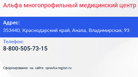 Альфа, многопрофильный медицинский центр по адресу 353440, Краснодарский край, Анапа, Владимирская, 93 в дальнейшем Организация, размещена в следующих категориях: