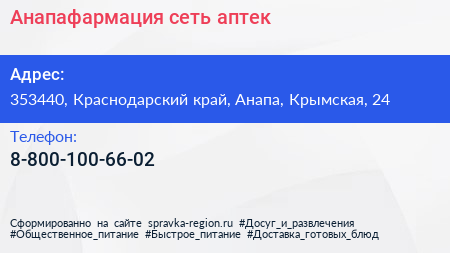Анапафармация, сеть аптек по адресу 353440, Краснодарский край, Анапа, Крымская, 24 в дальнейшем Организация, размещена в следующих категориях: