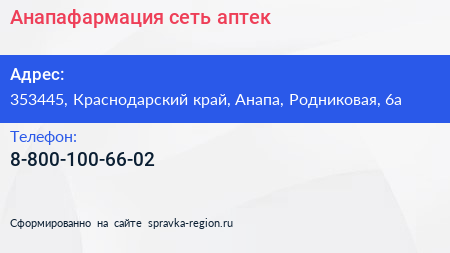 Анапафармация, сеть аптек по адресу 353445, Краснодарский край, Анапа, Родниковая, 6а в дальнейшем Организация, размещена в следующих категориях: