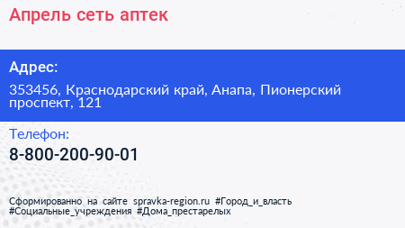 Апрель, сеть аптек по адресу 353456, Краснодарский край, Анапа, Пионерский проспект, 121 в дальнейшем Организация, размещена в следующих категориях: