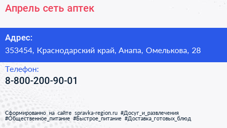 Апрель, сеть аптек по адресу 353454, Краснодарский край, Анапа, Омелькова, 28 в дальнейшем Организация, размещена в следующих категориях: