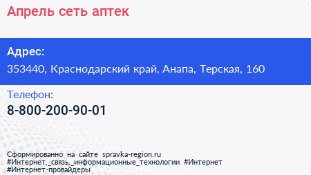Апрель, сеть аптек по адресу 353440, Краснодарский край, Анапа, Терская, 160 в дальнейшем Организация, размещена в следующих категориях: