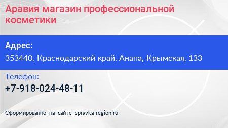 Аравия, магазин профессиональной косметики по адресу 353440, Краснодарский край, Анапа, Крымская, 133 в дальнейшем Организация, размещена в следующих категориях: