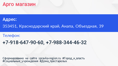 Арго, магазин по адресу 353451, Краснодарский край, Анапа, Объездная, 39 в дальнейшем Организация, размещена в следующих категориях: