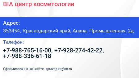 BIA, центр косметологии по адресу 353454, Краснодарский край, Анапа, Промышленная, 2д в дальнейшем Организация, размещена в следующих категориях: