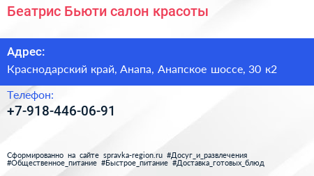 Беатрис Бьюти, салон красоты по адресу Краснодарский край, Анапа, Анапское шоссе, 30 к2 в дальнейшем Организация, размещена в следующих категориях: