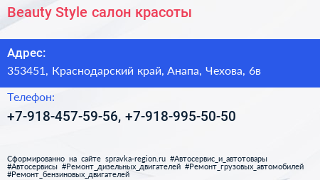 Beauty Style, салон красоты по адресу 353451, Краснодарский край, Анапа, Чехова, 6в в дальнейшем Организация, размещена в следующих категориях: