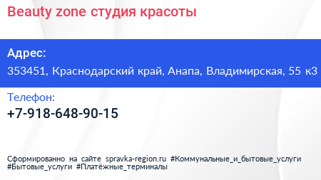Beauty zone, студия красоты по адресу 353451, Краснодарский край, Анапа, Владимирская, 55 к3 в дальнейшем Организация, размещена в следующих категориях: