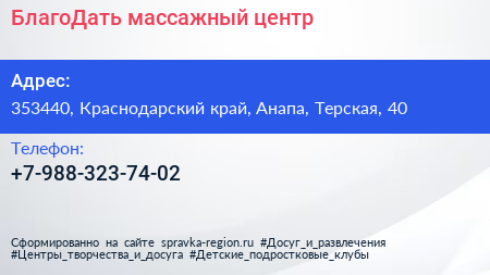 БлагоДать, массажный центр по адресу 353440, Краснодарский край, Анапа, Терская, 40 в дальнейшем Организация, размещена в следующих категориях: