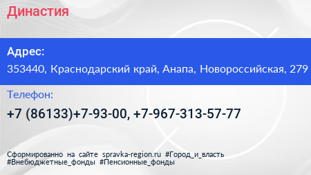 Династия по адресу 353440, Краснодарский край, Анапа, Новороссийская, 279 в дальнейшем Организация, размещена в следующих категориях: