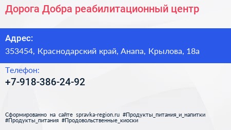 Дорога Добра, реабилитационный центр по адресу 353454, Краснодарский край, Анапа, Крылова, 18а в дальнейшем Организация, размещена в следующих категориях:
