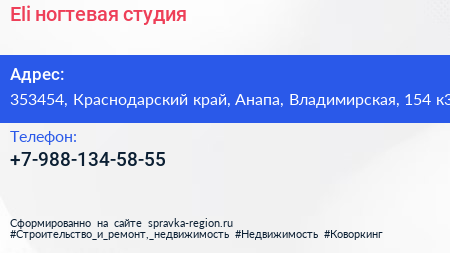 Eli, ногтевая студия по адресу 353454, Краснодарский край, Анапа, Владимирская, 154 к3 в дальнейшем Организация, размещена в следующих категориях: