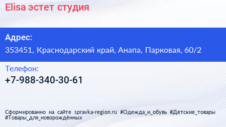 Elisa, эстет-студия по адресу 353451, Краснодарский край, Анапа, Парковая, 60/2 в дальнейшем Организация, размещена в следующих категориях: