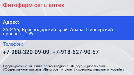 Фитофарм, сеть аптек по адресу 353456, Краснодарский край, Анапа, Пионерский проспект, 199 в дальнейшем Организация, размещена в следующих категориях: