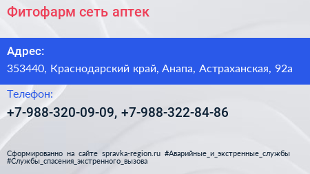 Фитофарм, сеть аптек по адресу 353440, Краснодарский край, Анапа, Астраханская, 92а в дальнейшем Организация, размещена в следующих категориях: