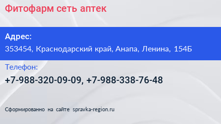 Фитофарм, сеть аптек по адресу 353454, Краснодарский край, Анапа, Ленина, 154Б в дальнейшем Организация, размещена в следующих категориях:
