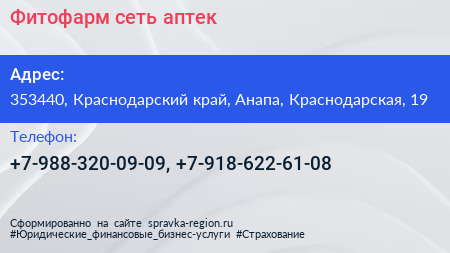Фитофарм, сеть аптек по адресу 353440, Краснодарский край, Анапа, Краснодарская, 19 в дальнейшем Организация, размещена в следующих категориях: