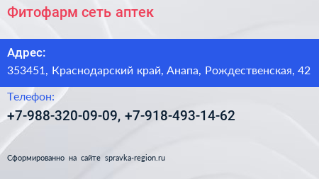 Фитофарм, сеть аптек по адресу 353451, Краснодарский край, Анапа, Рождественская, 42 в дальнейшем Организация, размещена в следующих категориях: