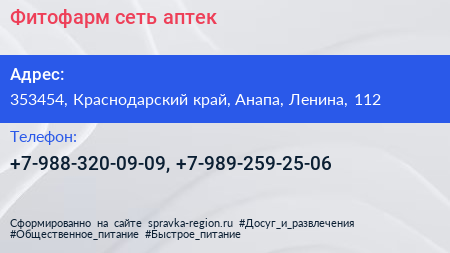 Фитофарм, сеть аптек по адресу 353454, Краснодарский край, Анапа, Ленина, 112 в дальнейшем Организация, размещена в следующих категориях: