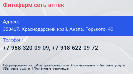 Фитофарм, сеть аптек по адресу 353417, Краснодарский край, Анапа, Горького, 40 в дальнейшем Организация, размещена в следующих категориях: