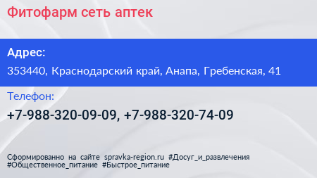 Фитофарм, сеть аптек по адресу 353440, Краснодарский край, Анапа, Гребенская, 41 в дальнейшем Организация, размещена в следующих категориях: