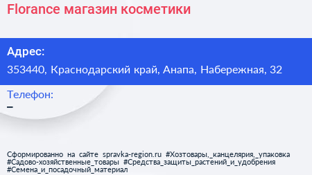 Florance, магазин косметики по адресу 353440, Краснодарский край, Анапа, Набережная, 32 в дальнейшем Организация, размещена в следующих категориях: