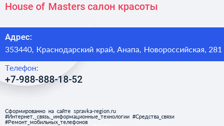 House of Masters, салон красоты по адресу 353440, Краснодарский край, Анапа, Новороссийская, 281 в дальнейшем Организация, размещена в следующих категориях: