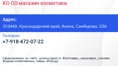 KO CO, магазин косметики по адресу 353440, Краснодарский край, Анапа, Самбурова, 236 в дальнейшем Организация, размещена в следующих категориях: