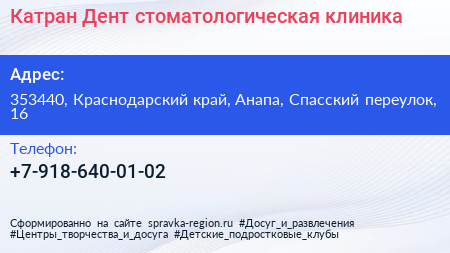 Катран Дент, стоматологическая клиника по адресу 353440, Краснодарский край, Анапа, Спасский переулок, 16 в дальнейшем Организация, размещена в следующих категориях:
