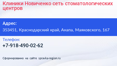 Клиники Новиченко, сеть стоматологических центров по адресу 353451, Краснодарский край, Анапа, Маяковского, 167 в дальнейшем Организация, размещена в следующих категориях:
