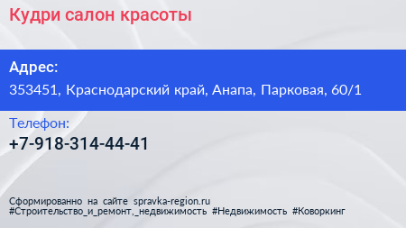 Кудри, салон красоты по адресу 353451, Краснодарский край, Анапа, Парковая, 60/1 в дальнейшем Организация, размещена в следующих категориях: