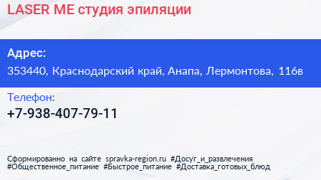 LASER ME, студия эпиляции по адресу 353440, Краснодарский край, Анапа, Лермонтова, 116в в дальнейшем Организация, размещена в следующих категориях: