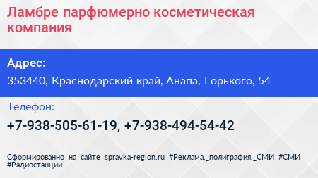 Ламбре, парфюмерно-косметическая компания по адресу 353440, Краснодарский край, Анапа, Горького, 54 в дальнейшем Организация, размещена в следующих категориях: