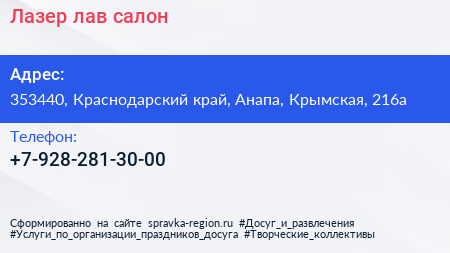 Лазер лав, салон по адресу 353440, Краснодарский край, Анапа, Крымская, 216а в дальнейшем Организация, размещена в следующих категориях: