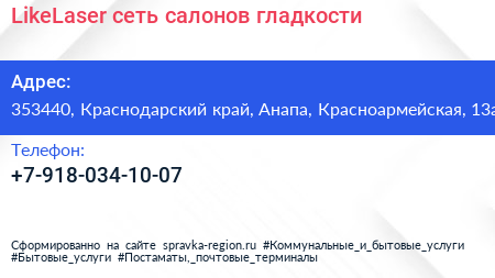 LikeLaser, сеть салонов гладкости по адресу 353440, Краснодарский край, Анапа, Красноармейская, 13а в дальнейшем Организация, размещена в следующих категориях: