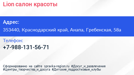 Lion, салон красоты по адресу 353440, Краснодарский край, Анапа, Гребенская, 58а в дальнейшем Организация, размещена в следующих категориях: