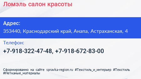 Ломэль, салон красоты по адресу 353440, Краснодарский край, Анапа, Астраханская, 4 в дальнейшем Организация, размещена в следующих категориях: