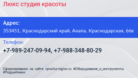 Люкс, студия красоты по адресу 353451, Краснодарский край, Анапа, Краснодарская, 66в в дальнейшем Организация, размещена в следующих категориях: