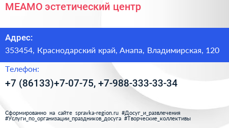MEAMO, эстетический центр по адресу 353454, Краснодарский край, Анапа, Владимирская, 120 в дальнейшем Организация, размещена в следующих категориях: