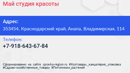 Май, студия красоты по адресу 353454, Краснодарский край, Анапа, Владимирская, 114 в дальнейшем Организация, размещена в следующих категориях: